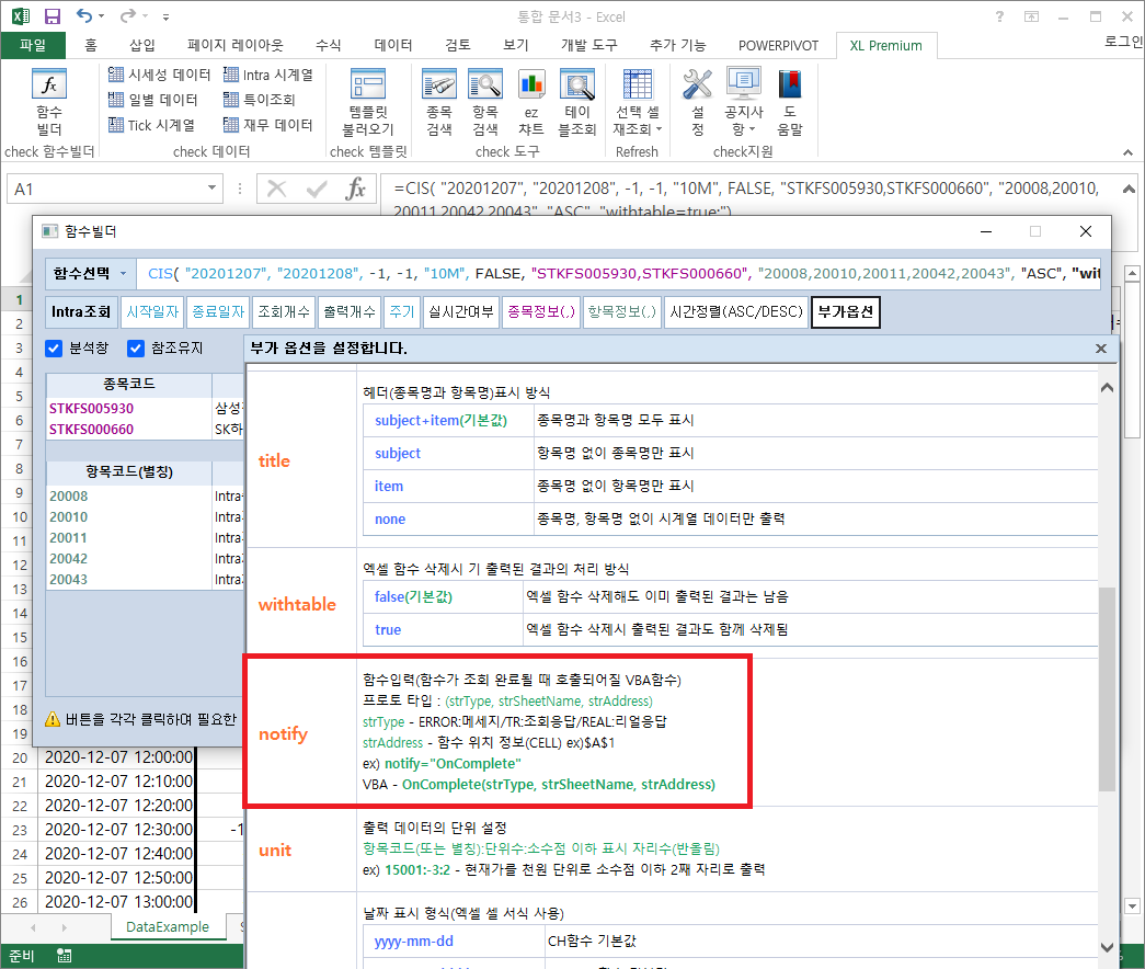 CIS함수가 발동되어 Intra 데이터를 불러와서 엑셀에 쓰고 완료되는 시점에서 내가 준비해놓은 VBA 함수를 발동시키도록 한다는 옵션이다. 얼마나 아름다운가. 그래서 내가 간단히 Subprocedure로 만들어서 Msgbox만 띄워보려고 했는데 아쉽게도 발동하지가 않더라. 혹시라도 사용해보신 분이 계시다면 노하우를 알려주시면 좋겠습니다 :>